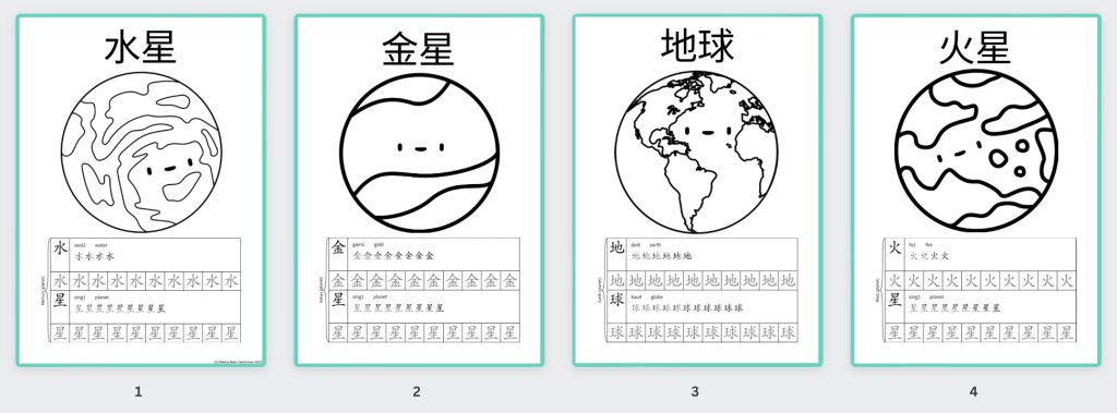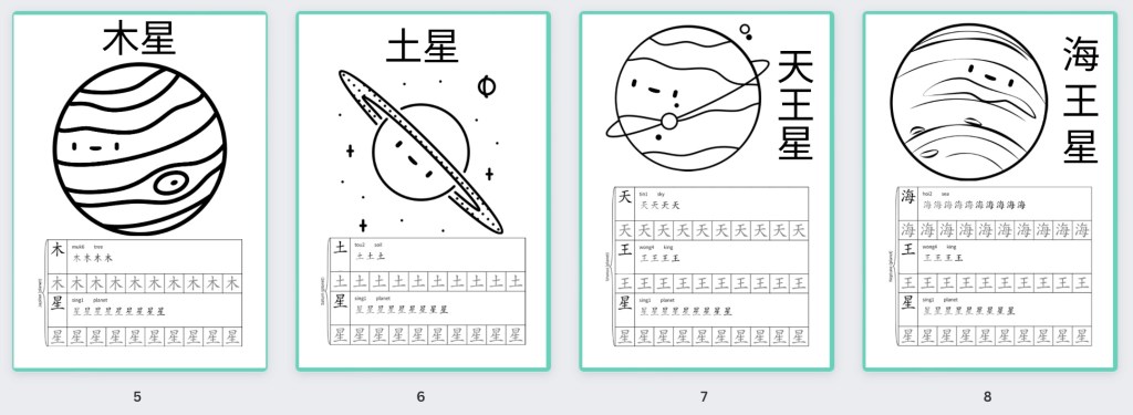 At first, I thought it would be difficult to learn the planets in Cantonese, being so used to their English names, but turns out their Chinese names are surprisingly simple. The first five planets (excluding planet Earth), were named after the five elements: Fire, Water, Earth, Wood, Metal. Chinese astronomers assigned the planets these elements based on the colour they appeared from Earth. So we got: