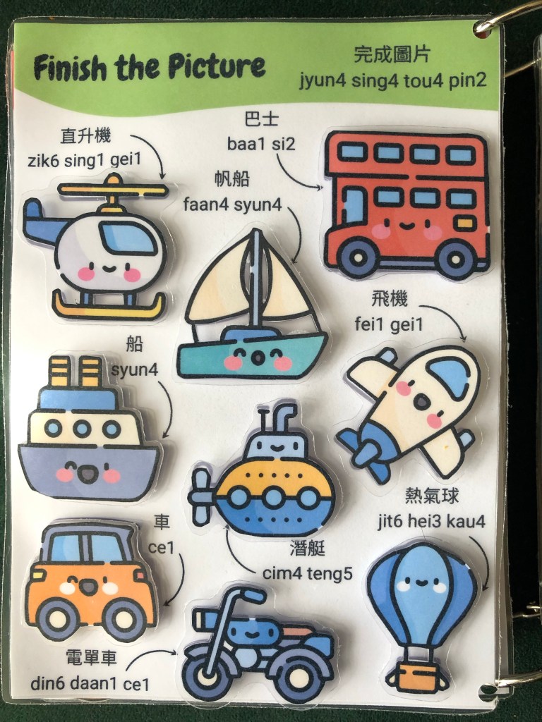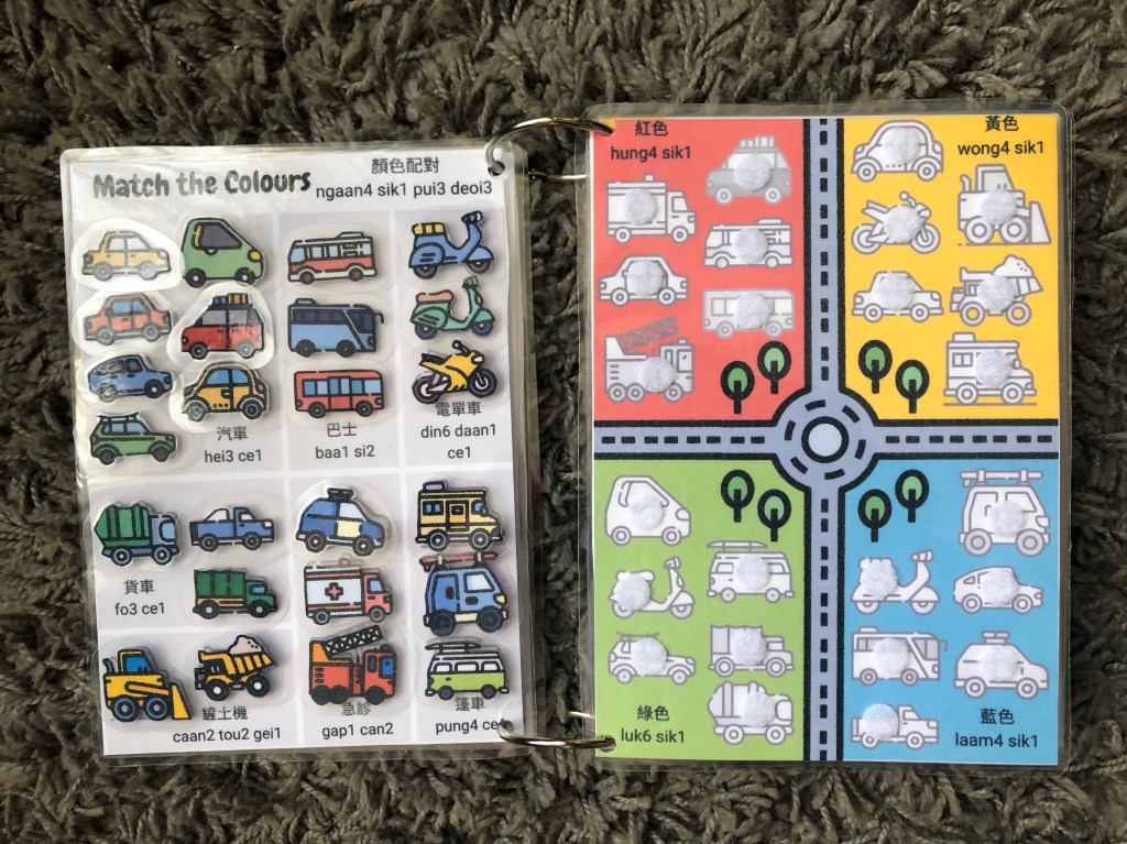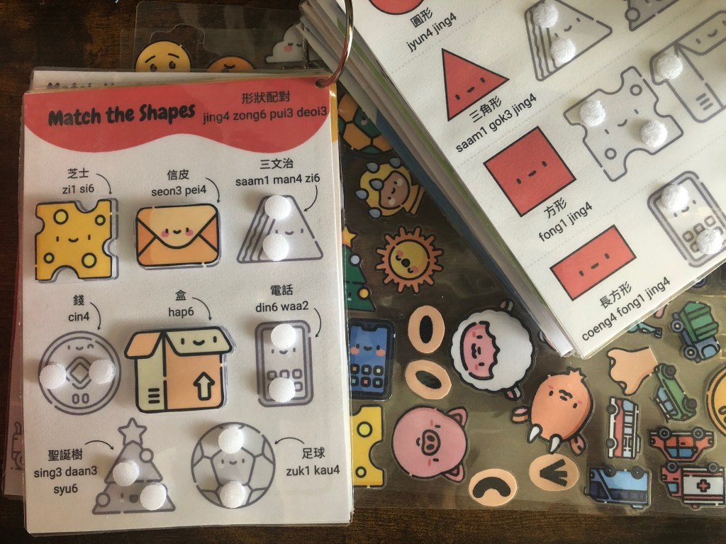 Unlike some busy books, I built in reverse activities for when you want to reset activities and pieces. For example, once you’ve categorised the household objects by shape, the reverse activity is to place the objects next to their names in Cantonese. I’ve tried to maximise the amount of Cantonese exposure to be gained throughout the book.