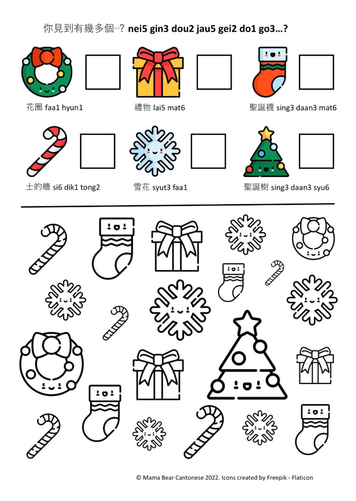In this activity, we are learning the names of different Christmas objects. Your child needs to count up how many of each object they can find in the picture below and colour each item in. Brownie points if they count in Cantonese!