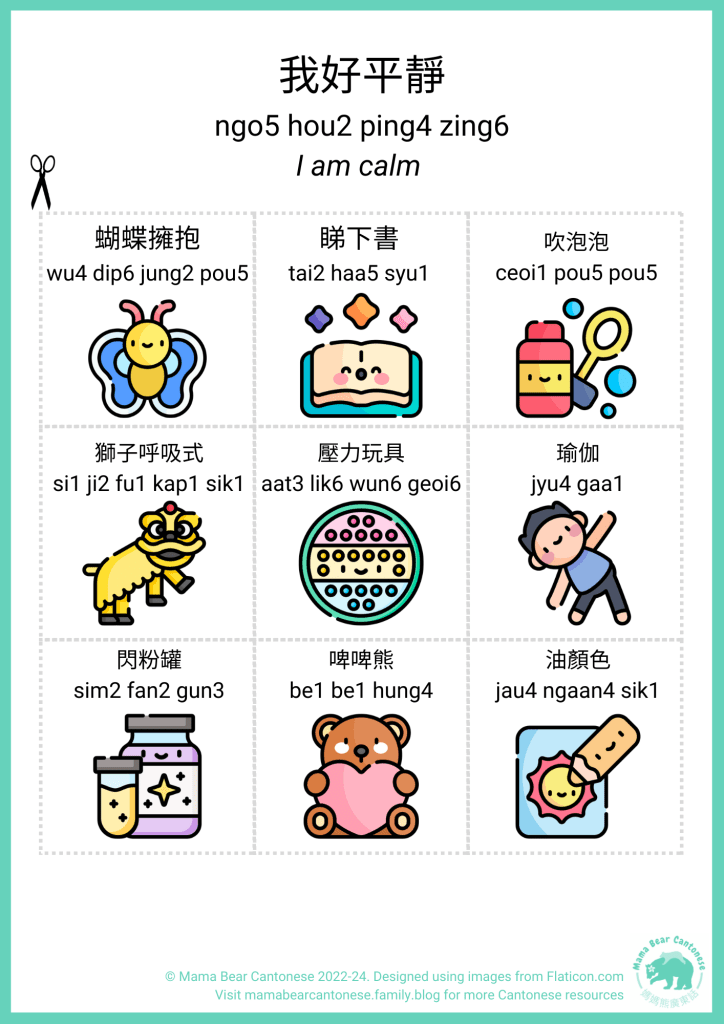 To help you get your own calming started, I’ve got three printables that, of course, are chock-a-block with Cantonese.
