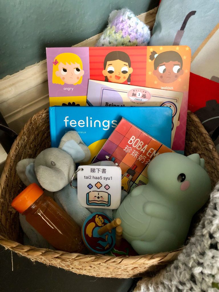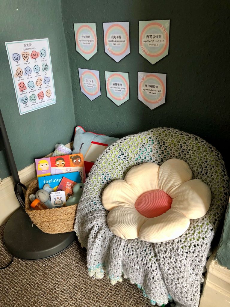 AJ is two and a half and as a first-time parent, I did not know how such a little man can contain such big feelings! So to help AJ (and myself) navigate these emotions, I’ve set up a calming corner in our home and of course, I’ve used this as another opportunity to increase Cantonese exposure!