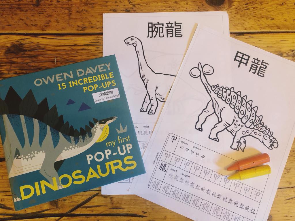 Today, I am delighted to bring you two activities that will help you and your child(ren) to learn the names of the dinosaurs in Cantonese. I was pleasantly surprised to discover that dinosaurs are way easier to name in Cantonese than English as the name often describes what the dinosaur is known for, e.g. a triceratops translates to ‘three horned dragon’. My favourite is velociraptor, which translates to ‘clever thief dragon’. Check out the dinosaurs below and let me know your favourite!