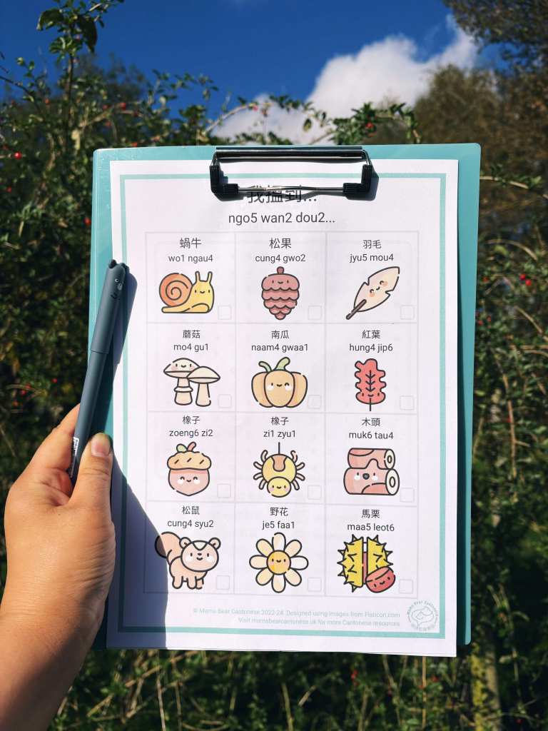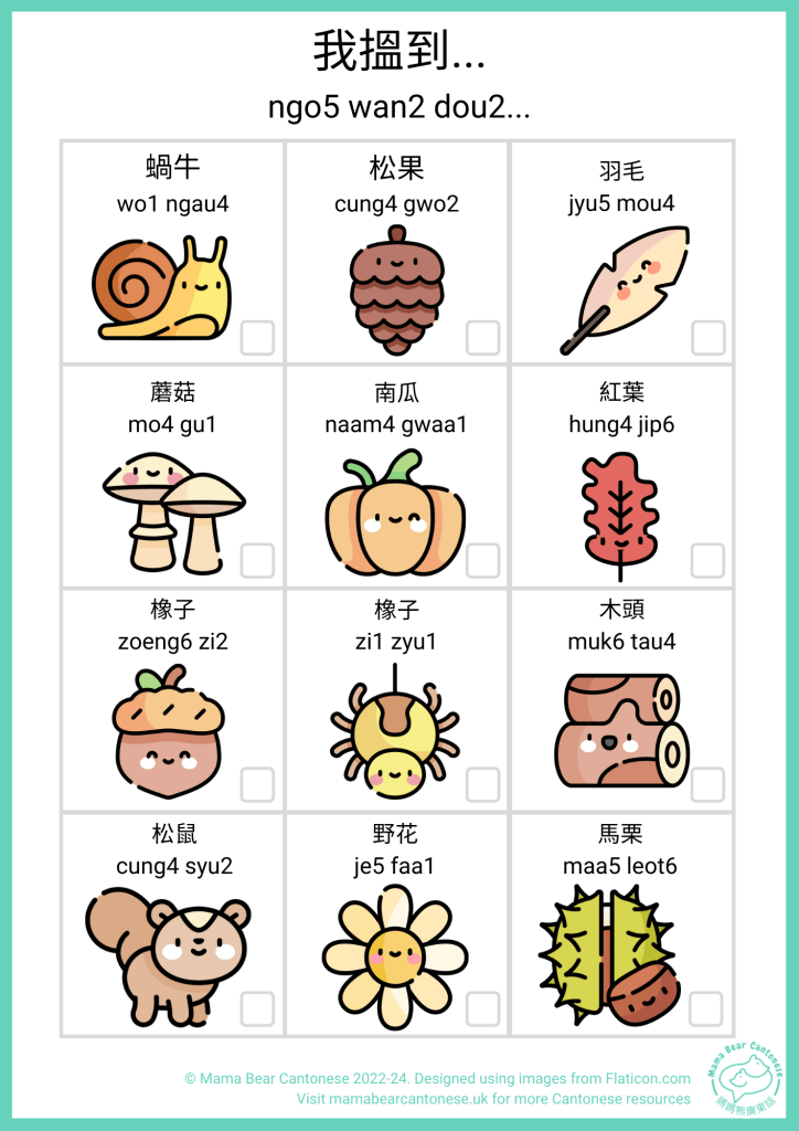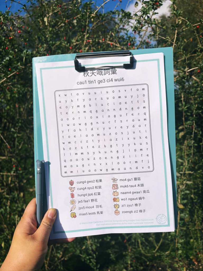 If the weather isn’t looking the best, you can still enjoy what Autumn has to offer from the comfort of your own home with this wordsearch. Try to find these Autumn words in jyutping (without the tones to keep it simple!)