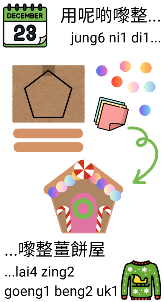 Activity: Cute out a pentagon from a large piece of cardboard. Use paper, pom poms, popsicle sticks and pens to decorate your gingerbread house!